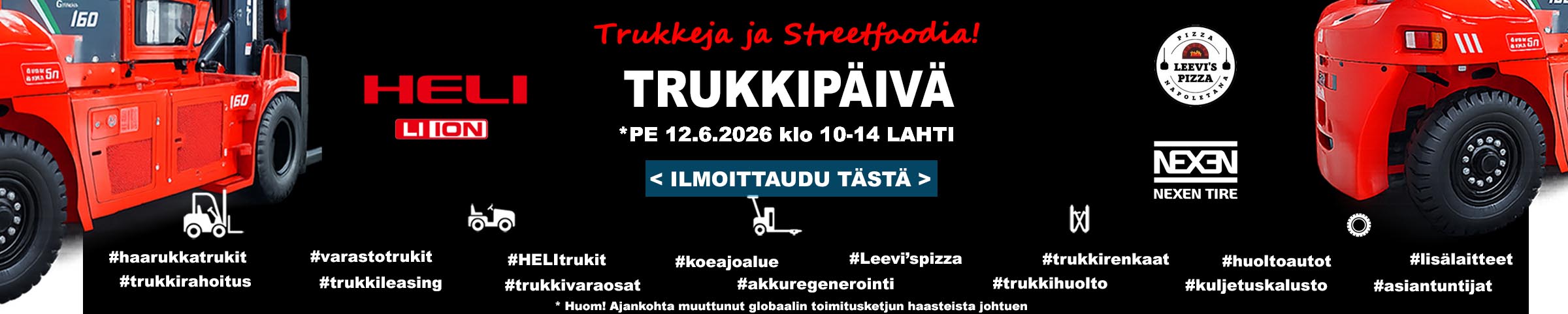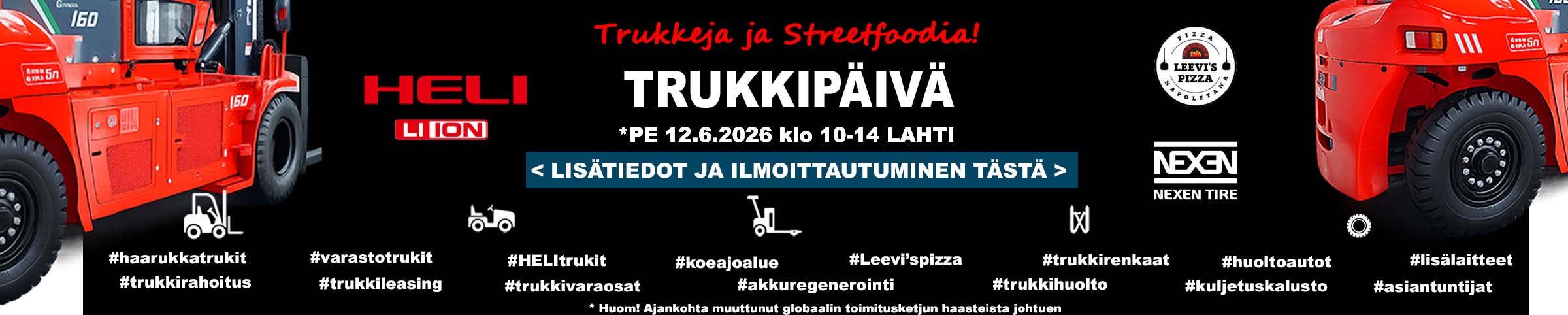 Uudet HELI ja CLARK -trukit, MAFI vetomestarit ja kotimaiset NOSTON kääntömastotrukit.