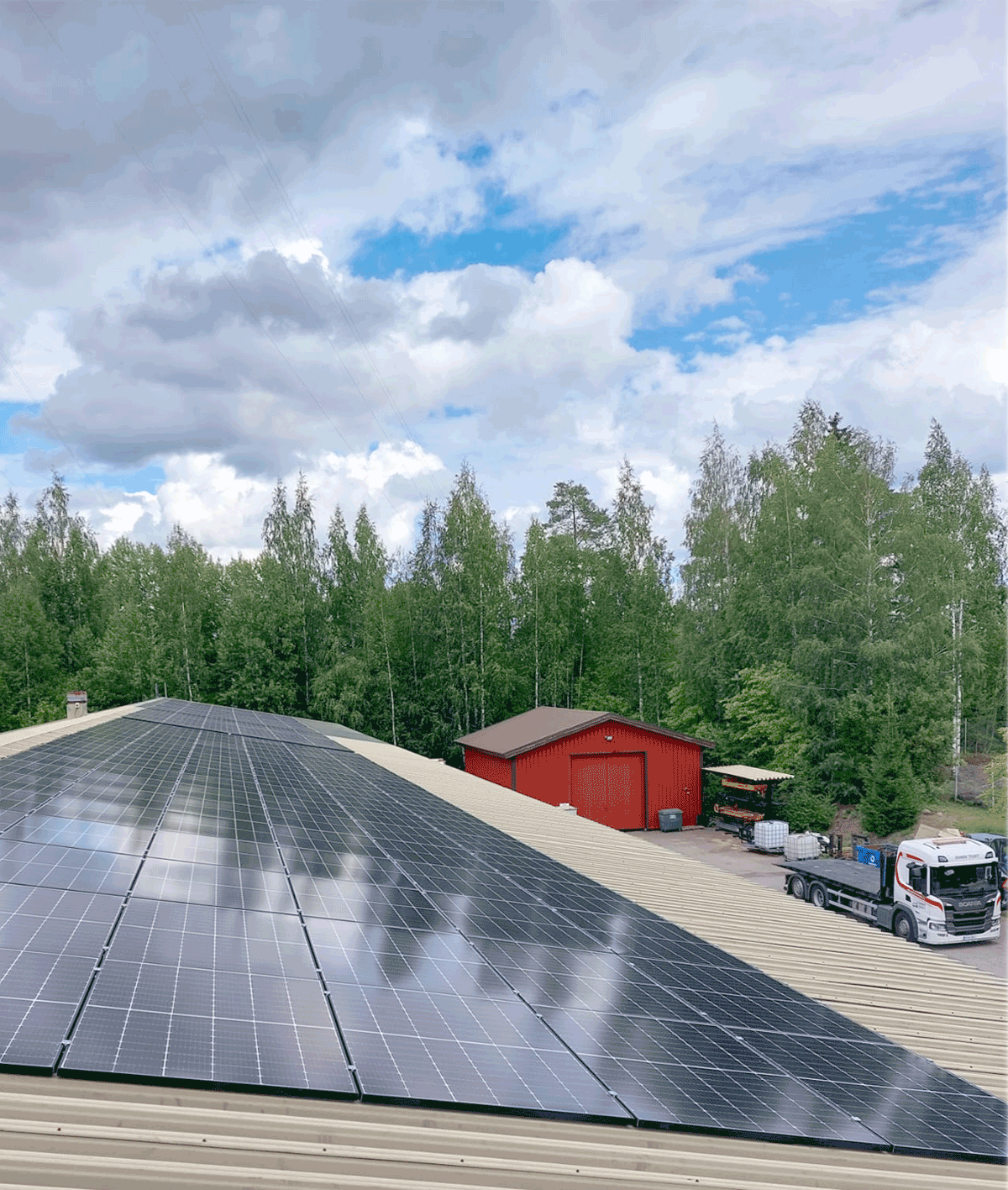 Vastuullisuuteen panostettiin aurinkoenergiajärjestelmän hankinnalla, joka lataa sähköllä toimivia HELI vuokratrukkeja ja tukee paikallista uusiutuvan energian tuotantoa.