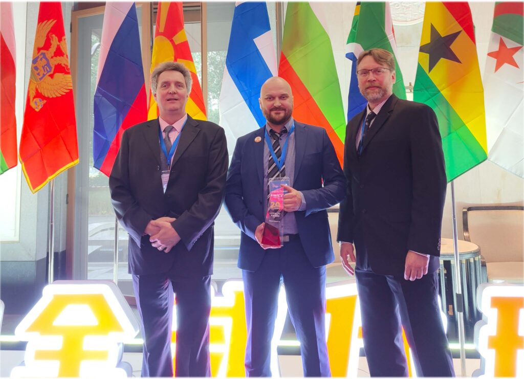 Kuvassa ylhäällä: trukkimyynnin Risto Niukkanen, Patrik Öhman ja Kimmo Kytölaakso. Öhman Trukeille myönnettiin Loyalty Award -palkinto 20 vuoden yhteistyöstä HELI Dealer Meetingin yhteydessä Kiinassa vuonna 2025.